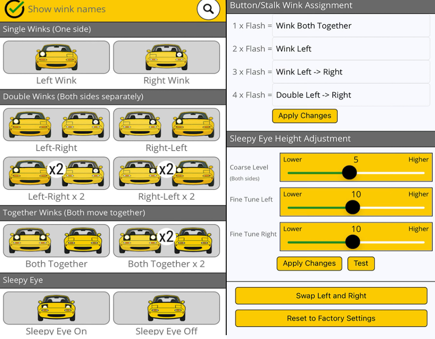 The Wink & Sleepy Eye Mod can be operated remotely via Bluetooth using our free mobile app for Android & Apple devices. Using the app, the user can also select which wink operation is linked to which button press conbination as well as setting the height of the Sleepy Eye. Security settings in the app ensure that only you can control your lights. See the SUPPORT page for details of how to use the mobile app.